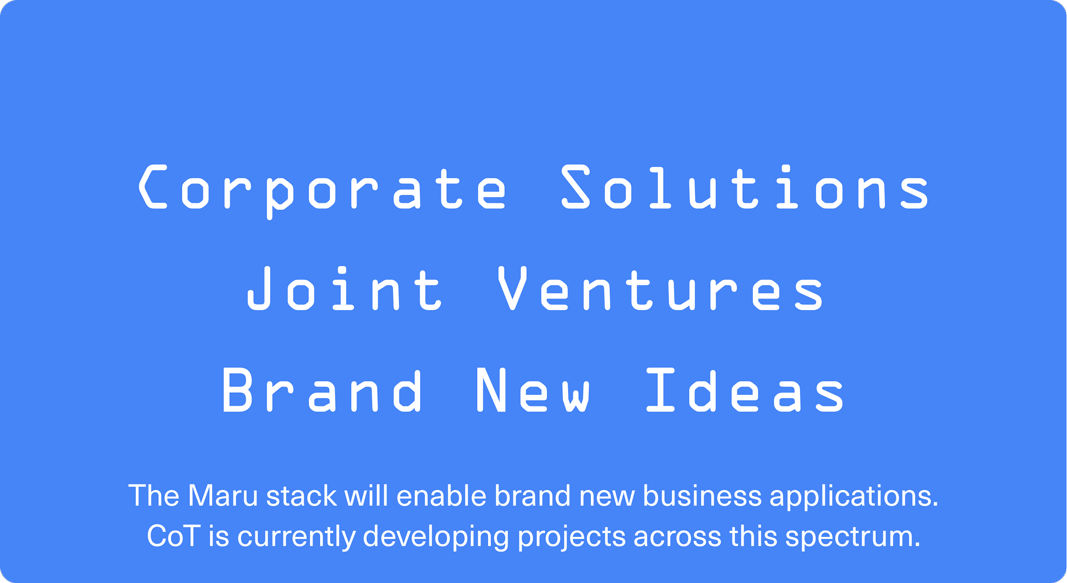 The Chain of Things ‘Maru’ sensor platform, a Hardware-as-a-Service (HaaS), is currently being developed to embrace these standards. Based on these new standards that allow greater trust of devices and data, brand new applications will then be developed to leverage them. These applications will be developed for corporate solutions, joint ventures, and internally developed concepts.