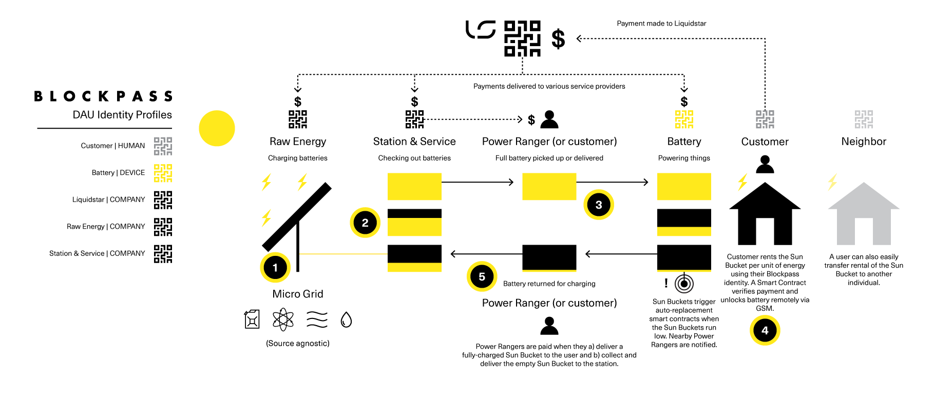 Liquidstar uses Blockpass; a blockchain-based, zero-knowledge proof identity protocol for regulated industries and the Internet of Everything (IoE). Liquidstar uses Blockpass to connect HUMAN+COMPANY+DEVICE identities to produce a low friction, highly efficient Decentralized Autonomous Utility (DAU) for swappable battery sharing.