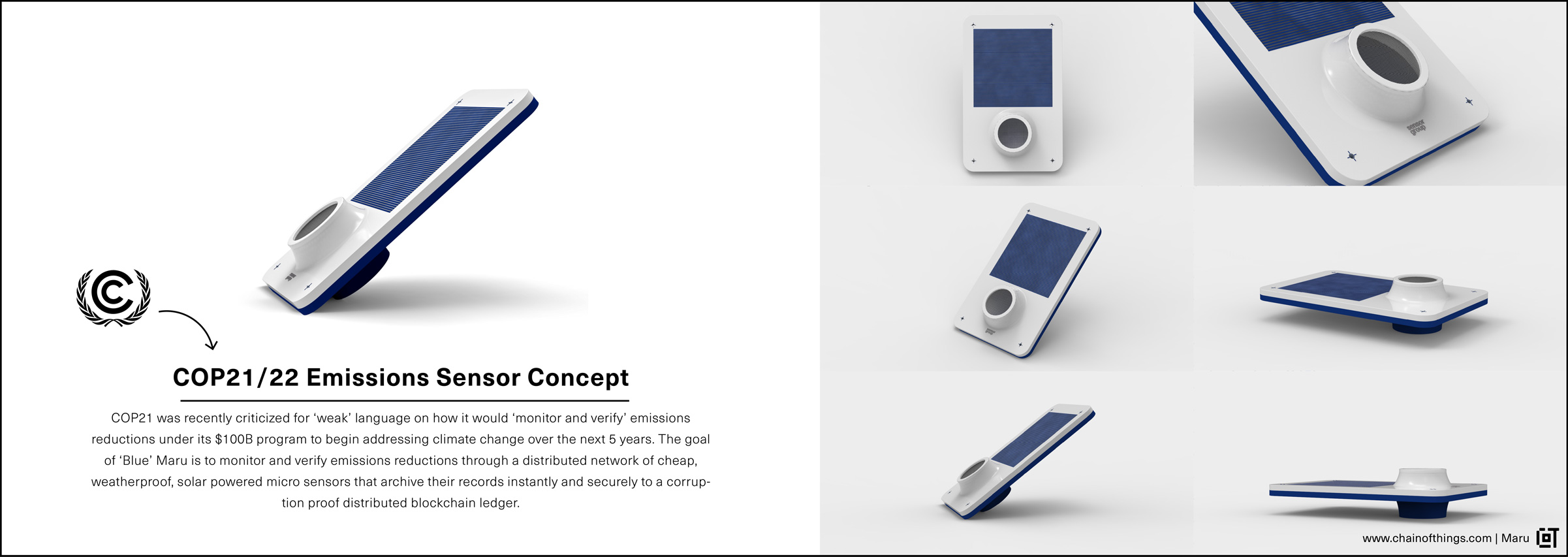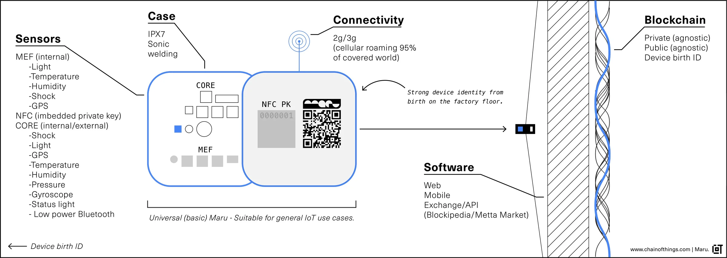 Chain of Things is developing Maru. Maru is a (basic, custom or layer) software and hardware platform that will embrace open standards of blockchain based device identity, security, and interoperability. CoT will use this platform to engage interested parties and use the (basic) Maru blockchain+IoT device to quickly and thoroughly conduct Case Study+Proof of Concept tests to illustrate potential commercial solutions. Depending on client needs, these solutions can easily move from proof of concept to scalable Hardware as a Service deployments in basic, custom, or layered formats.