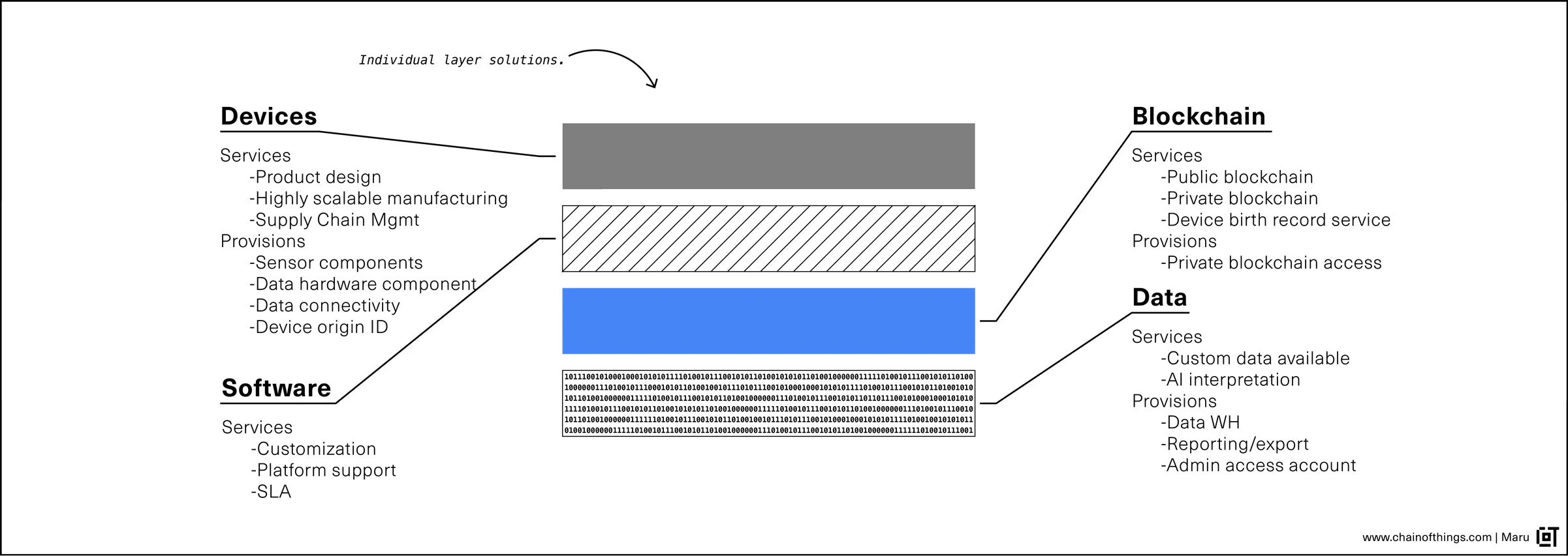Maru layers allows clients to choose à la carte from the stack to fit their needs. While some may require a complete end to end solution, others may only re- quire a single segment to complement their preexisting infrastructure. This provides a flexible solution for the needs of legacy industrials without competing with them directly or forcing them to discard and update their entire infrastructure.